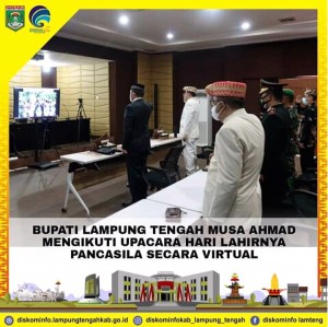 OTENTIK (LAMPUNG TENGAH) – Bupati Lampung Tengah Musa Ahmad mengikuti Upacara Hari Lahirnya Pancasila secara virtual di Rua ...