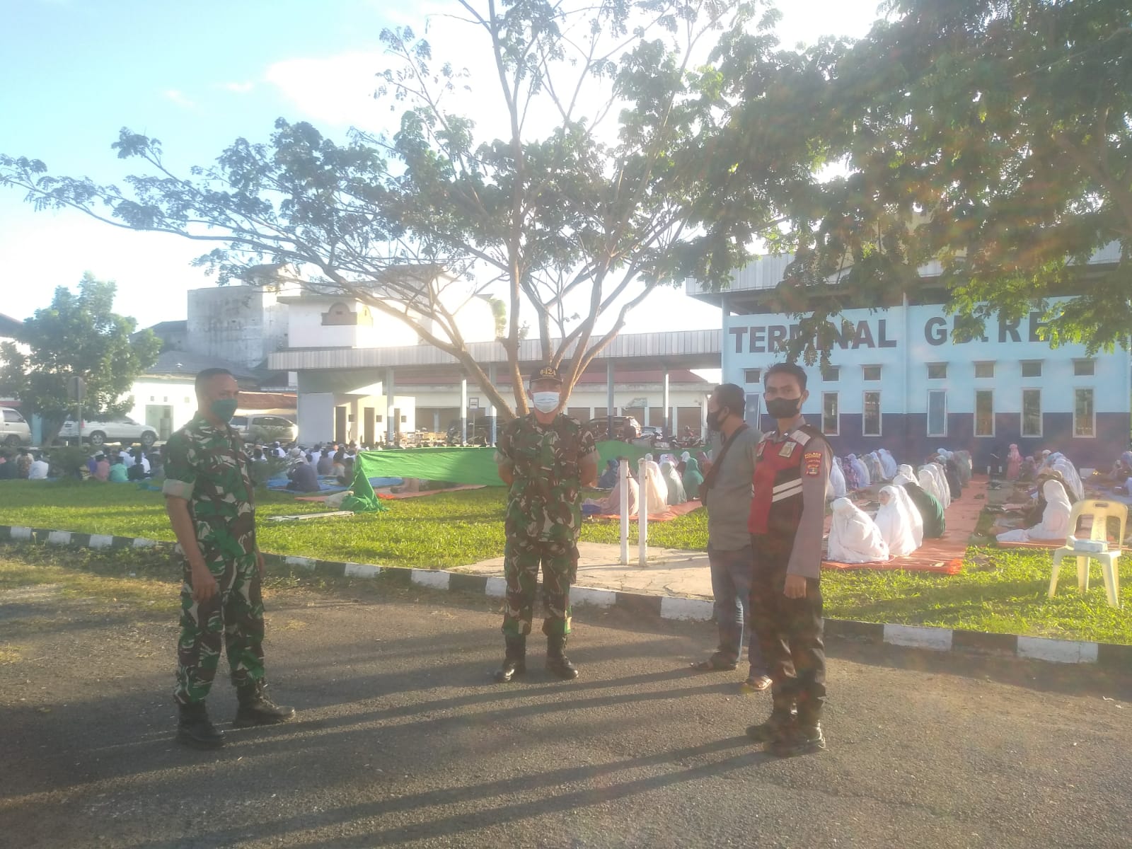 Seperti yang terlihat di lapangan terminal Gadingrejo tampak petugas kepolisian dibantu aparat TNI menjaga ratusan warga yang sedang melaksanakan sholat Ied.