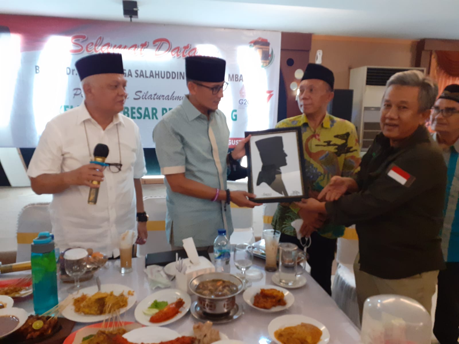 memberikan cenderamata kepada Sandiaga Salahuddin Uno dalam kunjungan