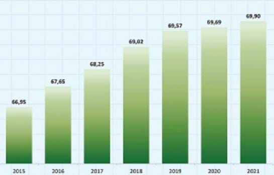 IPM 2018 (69,02), IPM 2019 (69,57), IPM 2020 (69,69), IPM 2021 (69,90), IPM