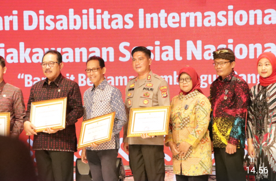 OTENTIK ( LAMSEL ) -- Kapolres Lampung Selatan AKBP Edwin SH.,S.ik.,M.Si menerima penghargaan dari Kementrian Sosial dalam rangka Hari Puncak Disabilitas Internasional (HDI) dan Hari Kesetiakawanan Sosial Nasional tahun 2022 di Alun-alun Ida Dewa Agung Jambe, Kabupaten Klunkung, Provinsi Bali, Selasa (20/12/22) sekira pukul 08.00 Wib