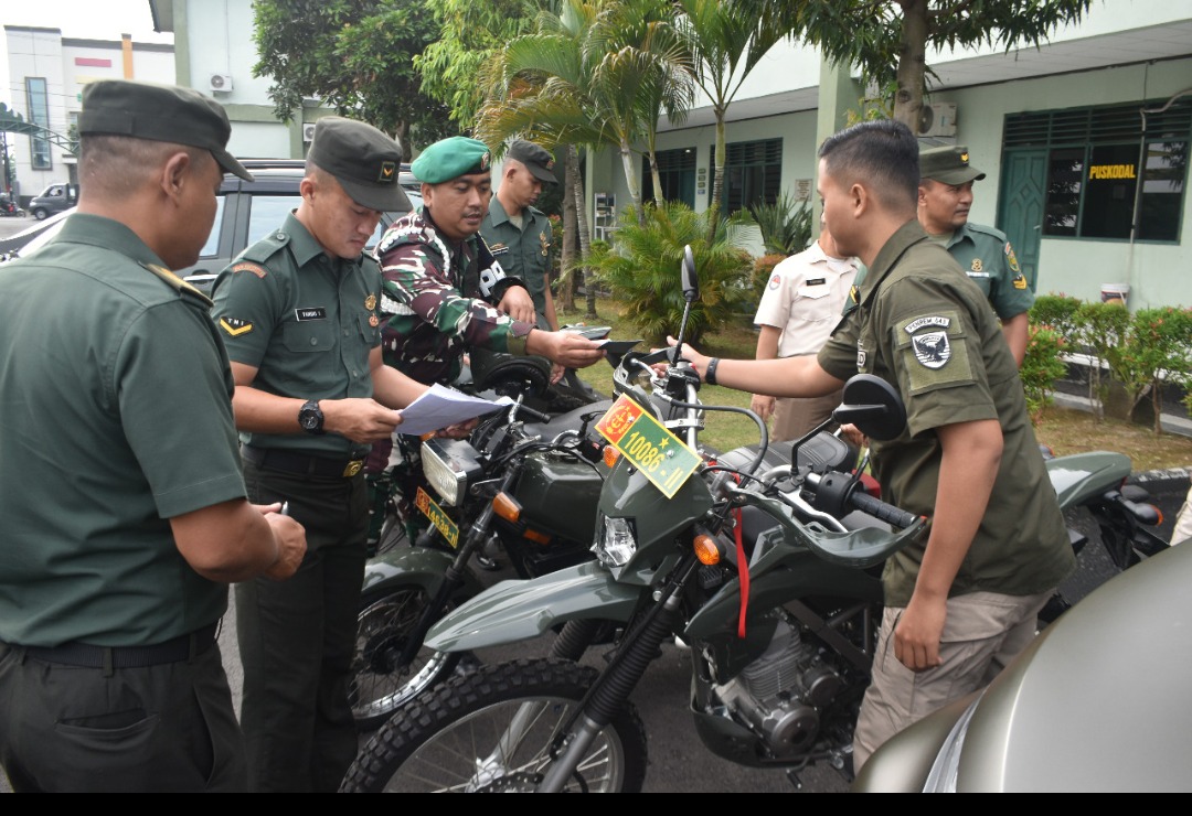 OTENTIK ( Lampung ) - Guna meningkatkan keamanan dan kenyamanan dalam berkendara, Korem 043/Garuda Hitam melaksanakan pengecekan surat-surat dan Kendaraan Dinas maupun Pribadi roda dua dan roda empat bertempat di lapangan apel Makorem 043/Gatam, Kamis (26/1/2023).