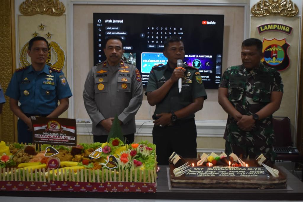 Sementara itu, Wakapolda Lampung mewakili Kapolda Lampung Irjen Pol Helmy Santika S.H.S.I.K.M.Si., mengucapkan terima kasih kepada Danrem, Danlanal, Danlanud dan Danbrigif yang telah memberikan kejutan pada kami di hari Bhayangkara ke 77.