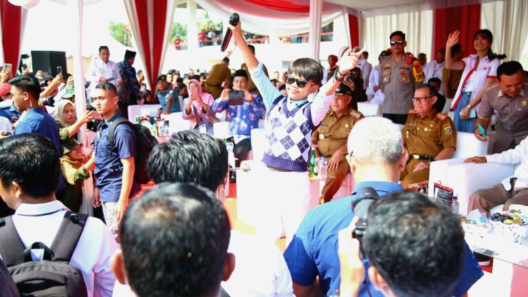 OTENTIK ( LAMSEL ) -- Penyanyi cilik Farel Prayoga ikut memeriahkan pembukaan Jumpa Bhakti Gembira (Jumbara) Palang Merah Remaja (PMR) ke-XI yang dipusatkan Stadion Jati, Kalianda, Kabupaten Lampung Selatan, Selasa (4/7/2023).