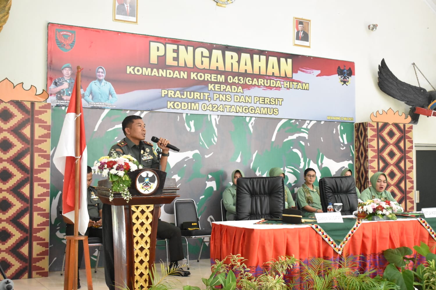 Selanjutnya Danrem juga menekankan agar prajurit dan PNS di satuan jajaran Korem 043/Gatam, untuk tidak tersandung dengan masalah hukum, hindari pelanggaran-pelanggaran dengan cara membina mental prajurit dan PNS serta dekatkan diri kepada yang maha kuasa.