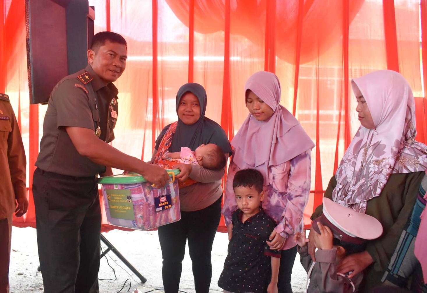 Tak hanya meresmikan fasilitas sumber air, kegiatan ini juga dilaksanakan pencanangan percepatan penurunan stunting dengan memberikan tali asih kepada 10 orang anak yang terdampak Stunting oleh Danrem o43/Gatam Brigjen TNI Iwan Ma'ruf Zainudin S.E.( Hdr/Penrem )