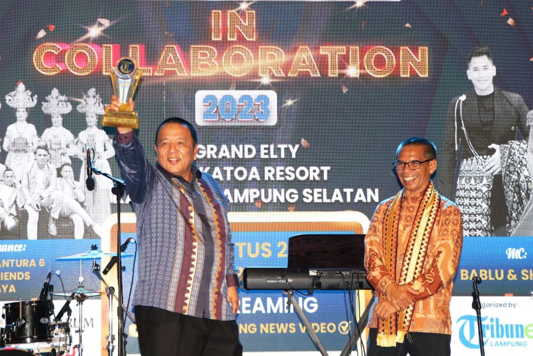 OTENTIK ( LAMPUNG SELATAN ) -- Gubernur Lampung Arinal Djunaidi terima penghargaan dalam ajang Tribun Lampung Award in Collaboration 2023 di Grand Elty Krakatoa Resort, Rabu (23/8/2023).