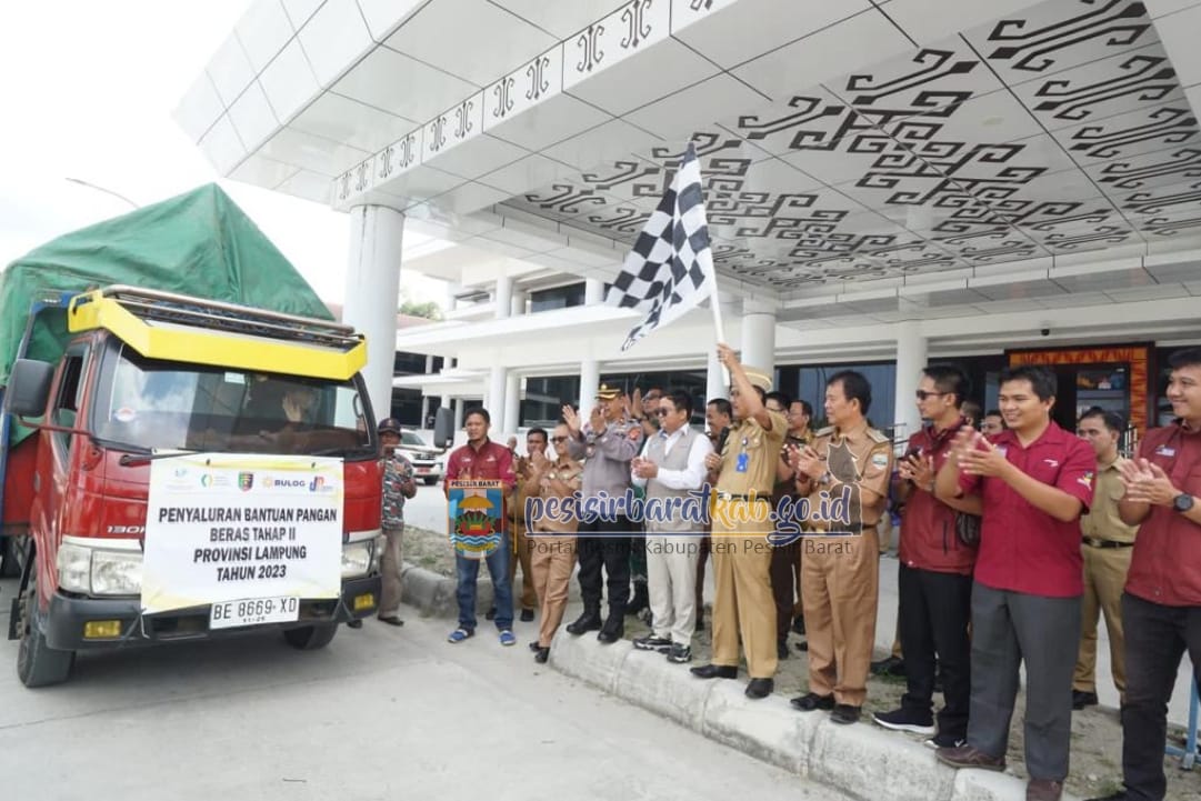 OTENTIK ( PESISIR BARAT ) -- Bupati Pesisir Barat (Pesibar), Dr. Drs. Agus Istiqlal, S.H., M.H., melepas sekaligus menyerahkan secara simbolis Penyaluran Bantuan Pangan Beras hasil kerjasama dari Perum Bulog Kantor Cabang Lampung Utara dan Pemkab Pesibar melalui Dinas Ketahanan Pangan dan Pertanian (DKPP) untuk 18.668 Keluarga Penerima Manfaat (KPM), di Selasar Utama Sekretariat Pemkab Pesibar, Senin (2/10).