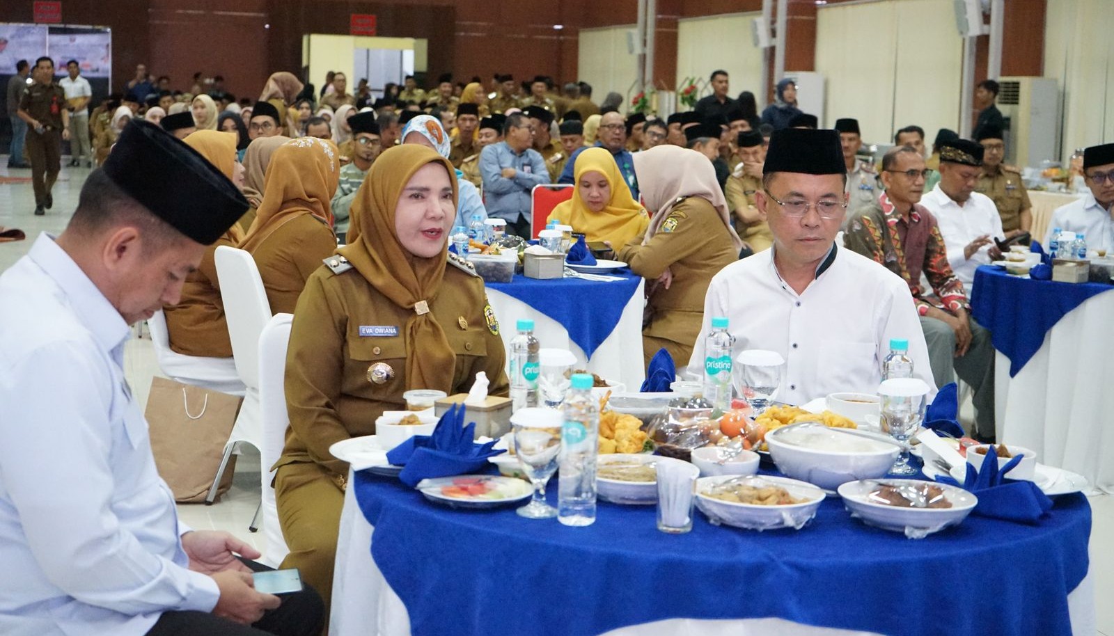 Usai menjalani retret di Akademi Militer (Akmil) Magelang, Jawa Tengah, Wali Kota Bandar Lampung Hj Eva Dwiana mengadakan silaturahmi dan buka puasa bersama, yang di hadiri oleh Forkopimda Kota Bandar lampung, FKUB, Kepala OPD, Camat, Lurah dan Kepala Puskesmas Se- Kota Bandar Lampung. Di Aula gedung Semergo, senin 3 Maret 2025.