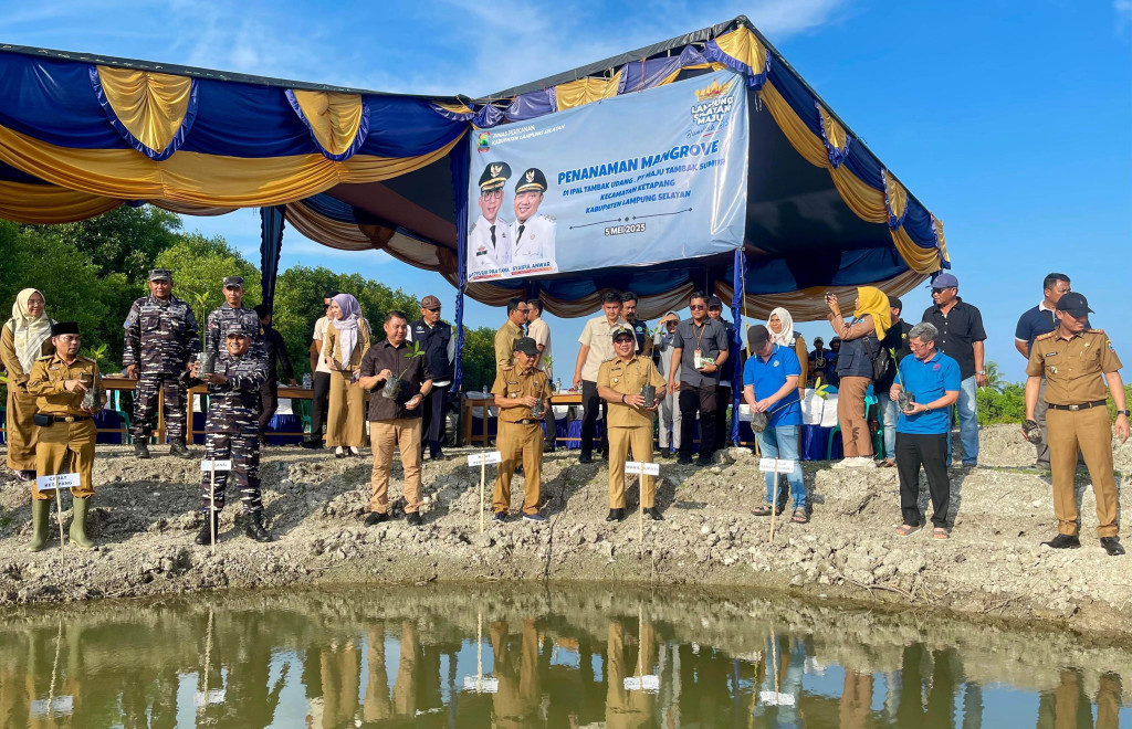 OTENTIK ( LAMSEL ) -- Wakil Bupati (Wabup) Lampung Selatan, M. Syaiful Anwar melakukan kegiatan penanaman mangrove di instalasi pengolahan air limbah (IPAL) Tambak Udang PT Maju Tambak Sumur, Desa Ruguk, Kecamatan Ketapang, Senin (5/5/2025).