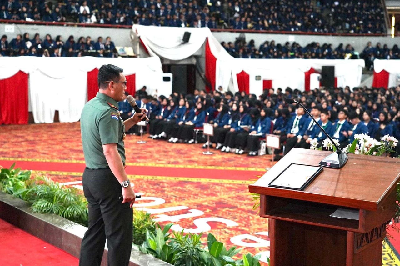 OTENTIK ( Lampung ) – Komandan Korem 043/Gatam Brigjen TNI Haryantana, S.H., memberikan materi tentang Kehidupan Berbangsa, Bernegara, dan Pembinaan Kesadaran Bela Negara pada Program Pengenalan Kehidupan Kampus Mahasiswa Baru (PKKMB) TA. 2025 kepada 4.000 mahasiswa baru Universitas Lampung (Unila). Kegiatan berlangsung di Gedung Serba Guna (GSG) Unila, Jl. Prof. Dr. Ir. Sumantri Brojonegoro, Bandar Lampung, Kamis (14/08/2024).