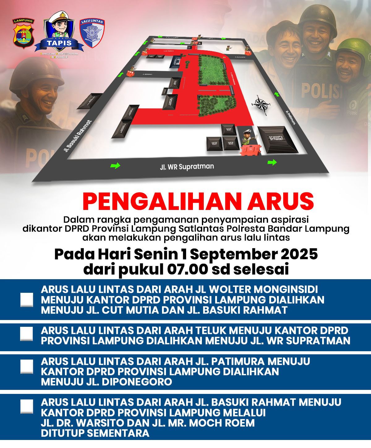 Pengalihan arus ini merupakan bagian dari upaya menciptakan lalu lintas yang aman, tertib, dan kondusif di sekitar kawasan DPRD Lampung selama berlangsungnya aksi penyampaian aspirasi. (***)