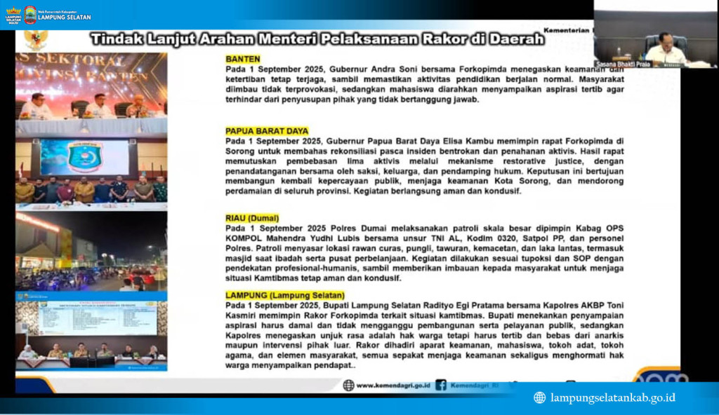Apresiasi itu disampaikan Tito dalam Rapat Koordinasi (Rakor) Pengendalian Inflasi Daerah secara virtual, Selasa (2/9/2025). Dalam forum tersebut, Mendagri menilai Lampung Selatan tampil menonjol karena dinilai berhasil membangun komunikasi dan konsolidasi lintas sektor secara efektif.