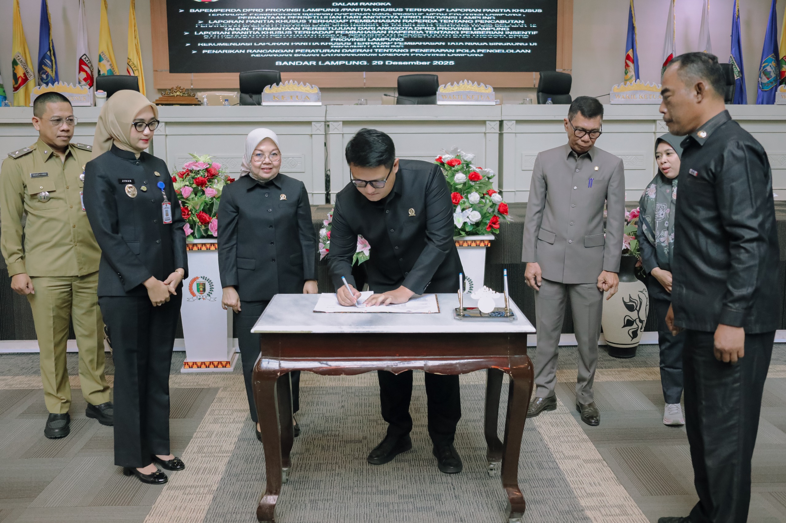 Apresiasi itu disampaikan Wagub Jihan saat Rapat Paripurna Penetapan Persetujuan atas enam Raperda Usul Inisiatif DPRD dan dua Raperda Prakarsa Pemerintah Provinsi Lampung di Ruang Sidang DPRD Provinsi Lampung, Senin (29/12/2025).