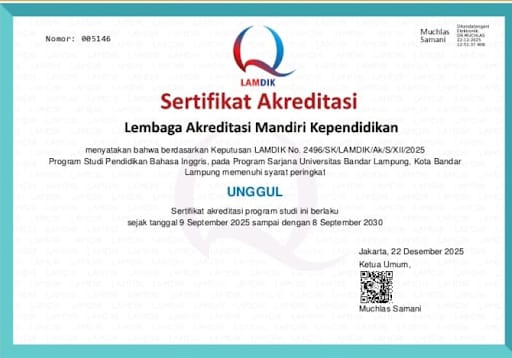 Capaian ini tertuang dalam Keputusan LAMDIK Nomor 496/SK/LAMDIK/Ak/S/XII/2025, yang menyatakan bahwa Prodi Pendidikan Bahasa Inggris UBL memenuhi syarat peringkat UNGGUL. Sertifikat akreditasi tersebut berlaku selama lima tahun, terhitung sejak 9 September 2025 hingga 8 September 2030, dan ditetapkan di Jakarta pada 22 Desember 2025.