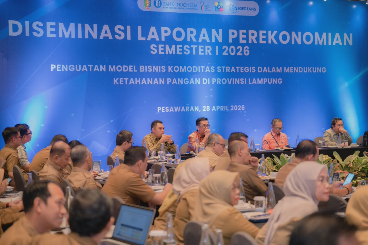 OTENTIK ( BANDARLAMPUNG ) -- Perwakilan Bank Indonesia Provinsi Lampung menyelenggarakan kegiatan Diseminasi Laporan Perekonomian Provinsi Lampung Semester I 2026 pada Selasa, 28 April 2026, sebagai bagian dari upaya memperkuat komunikasi kebijakan serta meningkatkan pemahaman pemangku kepentingan terhadap kondisi dan prospek ekonomi daerah. Kegiatan ini dirangkaikan dengan diskusi panel yang menghadirkan narasumber dari pemerintah pusat, pemerintah daerah, hingga pelaku usaha. Dalam kesempatan tersebut disampaikan bahwa perekonomian Provinsi Lampung tetap menunjukkan kinerja yang solid, dengan pertumbuhan Triwulan IV 2025 sebesar 5,54% (yoy) dan secara keseluruhan tahun 2025 mencapai 5,28% (ctc), yang terutama ditopang oleh kinerja sektor pertanian yang tetap kuat sebagai tulang punggung perekonomian Lampung.