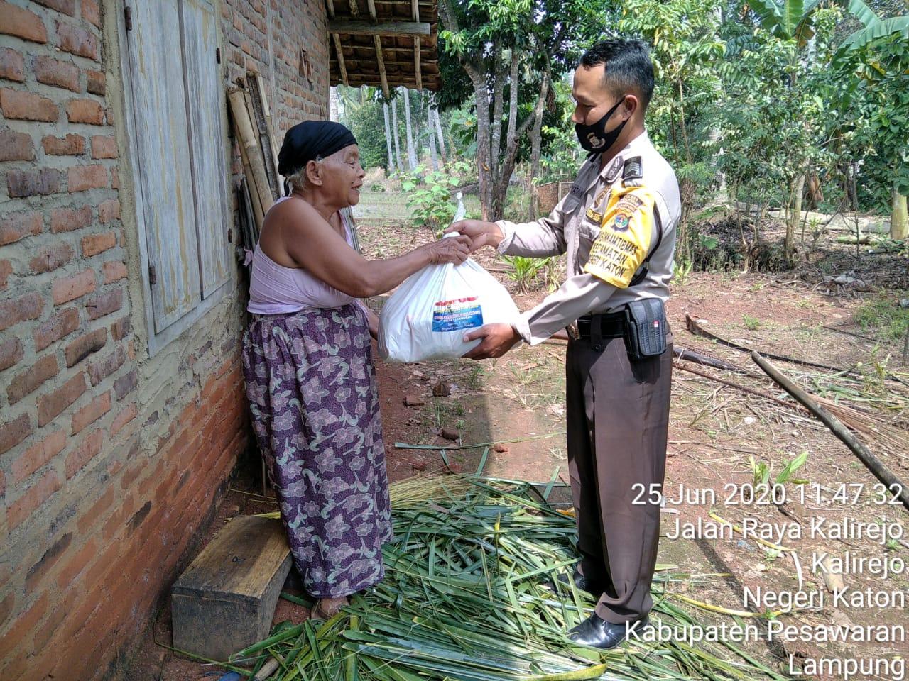 OTENTIK (PESAWARAN)—Dalam rangka Hari Ulang Tahun (HUT) ke - 74 Bhayangkara, Polsek Gedong Tataan melaksanakan kegiatan menyalurkan bantuan sosial dari Polres Pesawaran di Desa Kalirejo Kecamatan Negeri Katon Kabuapaten Pesawaran, Kamis (25/6/2020).