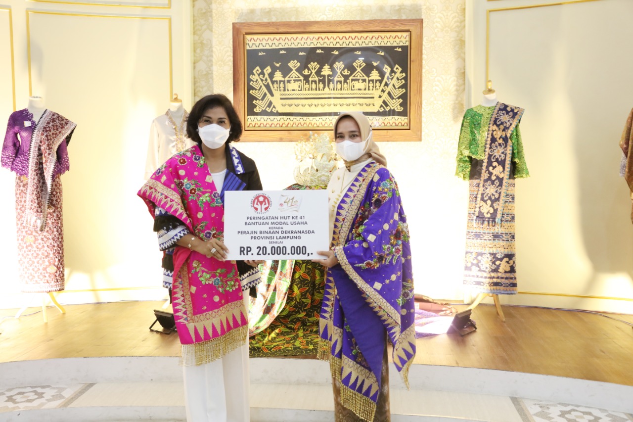 Dekranasda Provinsi Lampung Ibu Riana Sari Arinal menyerahkan bantuan modal