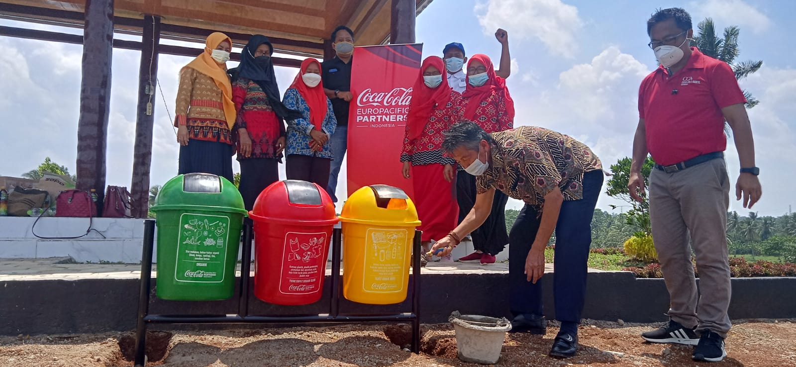 OTENTIK (LAMPUNG SELATAN) – Senin, 16 Agustus 2021. Coca-Cola Europacific Partners (CCEP) Indonesia bersama Forum Pendidik Desa Sukanegara, Lampung Selatan, menyerahkan donasi tempat sampah kepada Pemerintah Kabupaten Lampung Selatan melalui Dinas Lingkungan Hidup Lampung Selatan. Kegiatan sekaligus pemasangan tempat sampah tersebut dilakukan di Kebun Edukasi Rumah Dinas Bupati Lampung Selatan, melibatkan para penggiat lingkungan dan pendidikan Senin, 16 Agustus 2021.