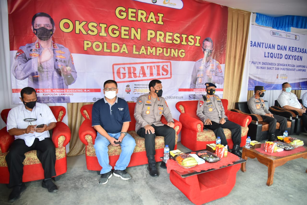 Wakapolda Lampung Brigjend Subiyanto menerima langsung penyerahan bantuan oksigen liquid dari PT Pusri yang diserahkan oleh direktur operasional dan produksi Filius Yuliandi disaksikan dari DPR RI Sudin dan DPRD Provinsi Lampung Kostiana serta Pejabat Utama Polda Lampung.