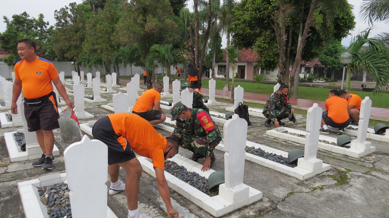 Jelang HUT ke-74, Prajurit dan ASN Korem 043/Gatam Bhakti Sosial Pembersihan Makam Pahlawan